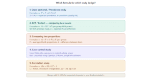 The formula you use for sample size calculation depends entirely on your study design. This is the most important point — one single formula cannot work for all designs. Here are the most commonly used formulas for medical thesis research.